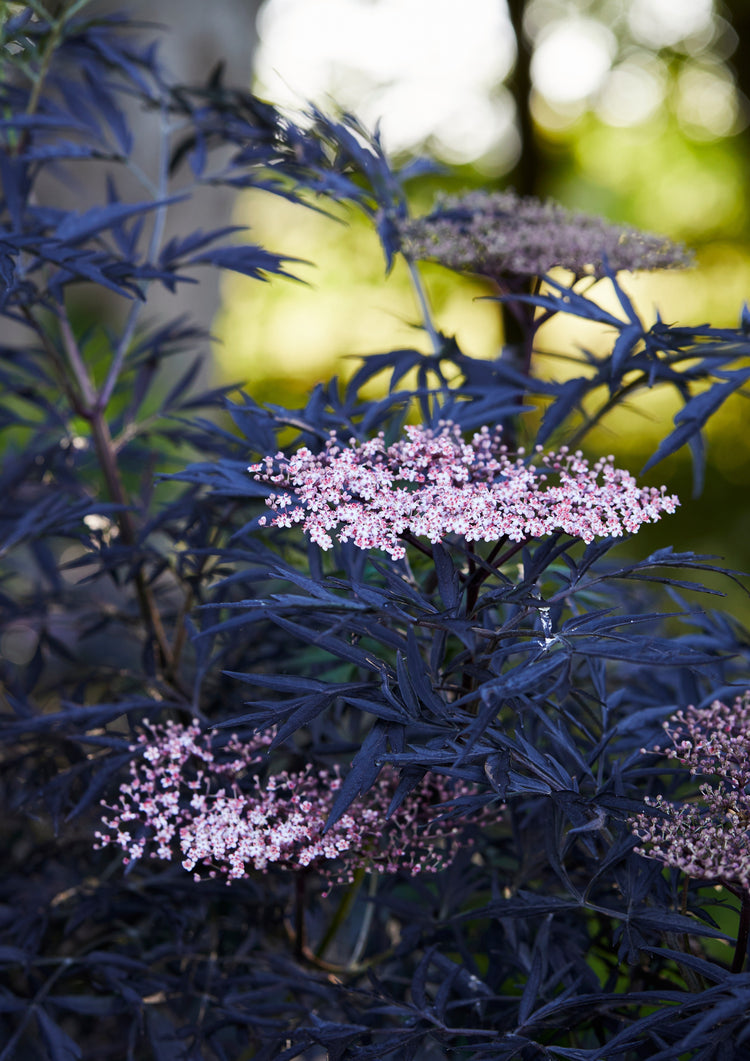 A strip of Sambuca Nigra ‘black lace’ forms a tall hedgerow along the boundary between the cutting garden and the water meadows beyond. The long elegantly arching branches with delicately serrated pink-black leaves create a wonderfully fragrant backdrop to the frothy rows of flowers in the cutting garden. In summer we pick the softly pink and delicately scented flowers to make the most delicious cordials, cocktails, jellies and jams bringing their heady scent to our menus, they are the very essence of summer.